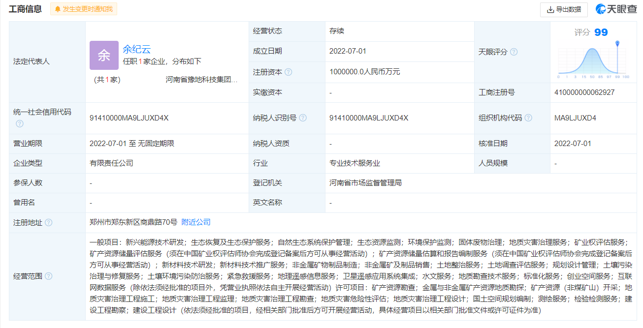 工商注册信息显示,河南省豫地科技集团经营范围包括新兴能源技术研发;生态恢复及生态保护服务;自然生态系统保护管理;生态资源监测;环境保护监测;固体废物治理;地质灾害治理服务;矿业权评估服务;矿产资源储量评估服务;地质勘查技术服务;矿产资源勘查;国土空间规划编制;建设工程勘察;建设工程设计等。
