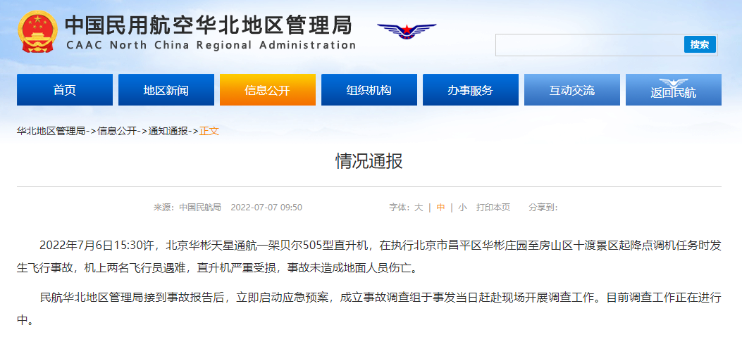 据中国民用航空华北地区管理局网站消息,2022年7月6日15:30许,北京华彬天星通航一架贝尔505型直升机,在执行北京市昌平区华彬庄园至房山区十渡景区起降点调机任务时发生飞行事故,机上两名飞行员遇难,直升机严重受损,事故未造成地面人员伤亡。