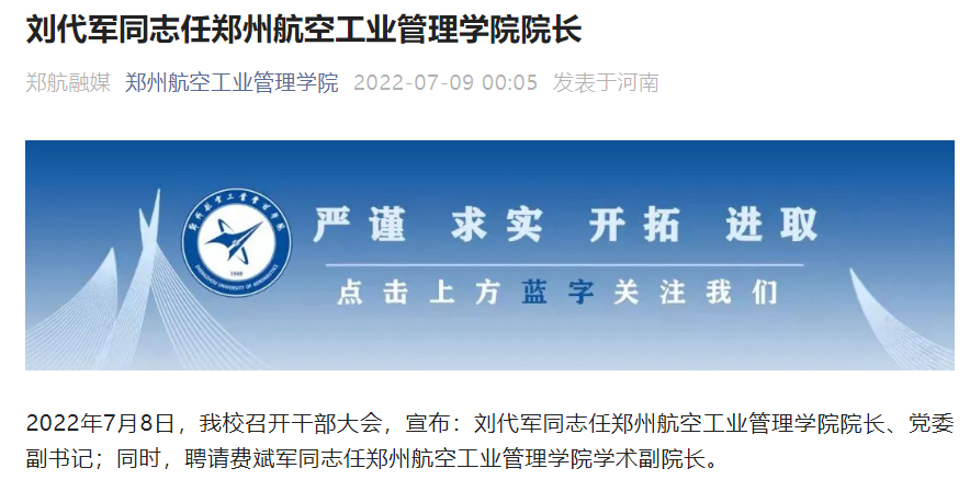 2022年7月8日, 郑州航空工业管理学院召开干部大会,宣布:刘代军同志任郑州航空工业管理学院院长、党委副书记;同时,聘请费斌军同志任郑州航空工业管理学院学术副院长。