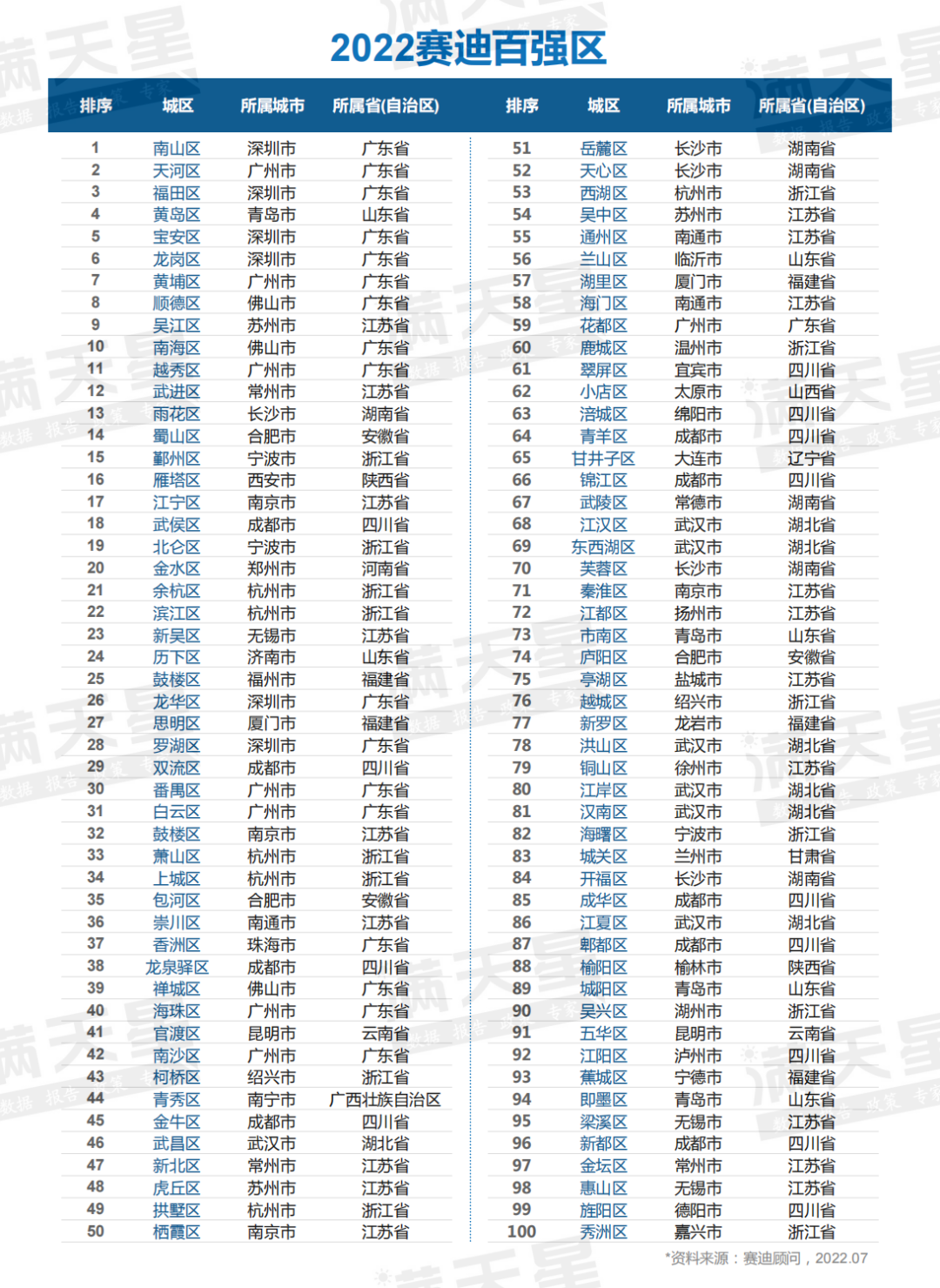 榜单显示,深圳南山区、广州天河区、深圳福田区、青岛黄岛区、深圳宝安区、深圳龙岗区、广州黄埔区、佛山顺德区、苏州吴江区和佛山南海区入围“十强”城区,其高质量发展水平领跑全国。