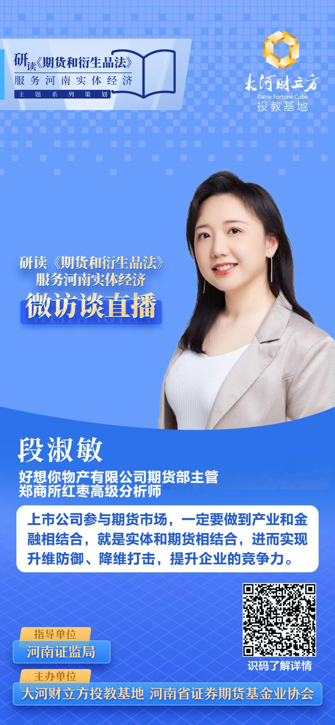 8月1日,《期货和衍生品法》实施首日,在河南证监局指导下,大河财立方投教基地联合河南省证券期货基金业协会主办“研读《期货和衍生品法》,服务河南实体经济”微访谈直播活动,邀请到好想你物产有限公司期货部主管、郑商所红枣高级分析师段淑敏。