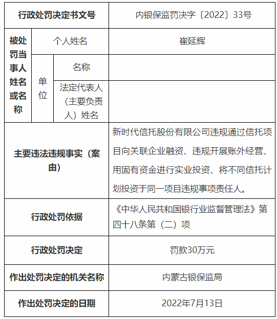 崔延辉作为新时代信托违规通过信托项目向关联企业融资、违规开展账外经营、用固有资金进行实业投资、将不同信托计划投资于同一项目违规事项责任人,被处罚30万元。