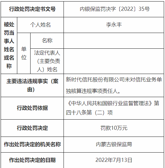 李永丰作为新时代信托未对信托业务单独核算违规事项责任人,被处罚10万元。
