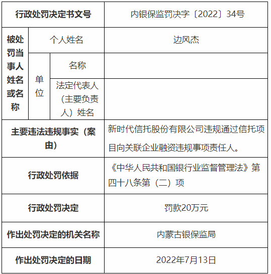 边风杰作为新时代信托违规通过信托项目向关联企业融资违规事项责任人,被处罚20万元。