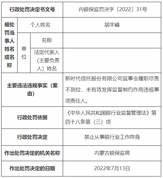 胡宇峰作为新时代信托监事会履职尽责不到位,未有效发挥监督制约作用违规事项责任人,被终身禁止从事银行业工作。