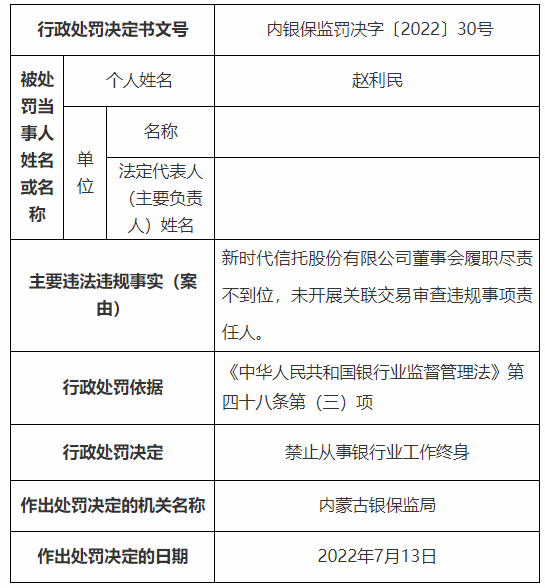 此外,赵利民作为新时代信托董事会履职尽责不到位,未开展关联交易审查违规事项责任人,被终身禁止从事银行业工作。