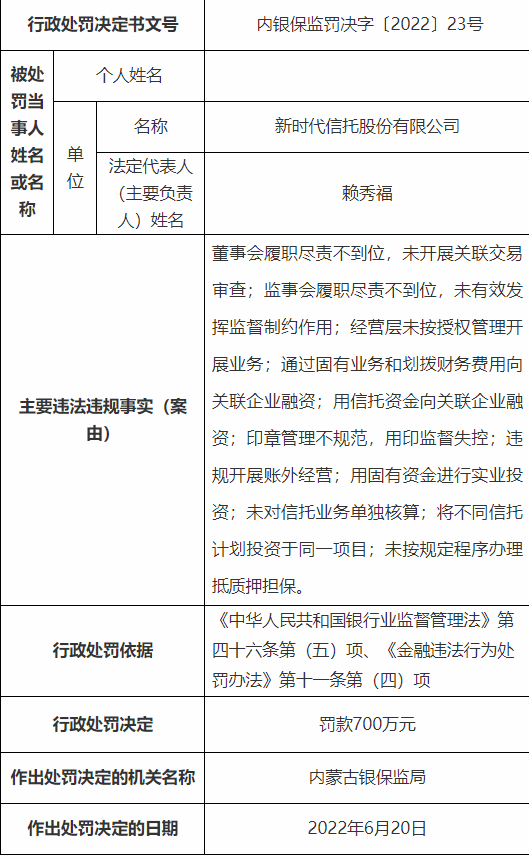 根据《中华人民共和国银行业监督管理法》第四十六条第(五)项、《金融违法行为处罚办法》第十一条第(四)项,内蒙古银保监局对新时代信托处罚700万元。