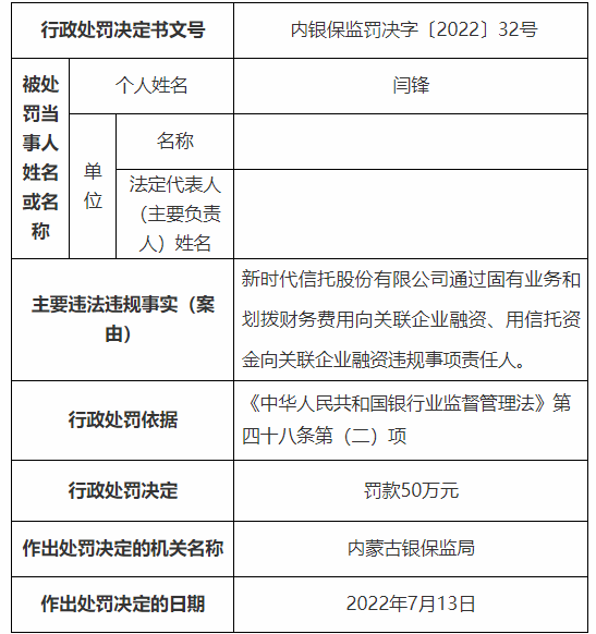 闫锋作为新时代信托通过固有业务和划拨财务费用向关联企业融资、用信托资金向关联企业融资违规事项责任人,被处罚50万元。