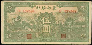 冀南银行钞票种类包括铜元票、银角票和银元票,票面的设计风格采用当时民国纸币比较流行的对称式和平均式,简单大方,符合审美要求。票券主图案的选择和运用,与根据地的发展壮大息息相关。早期票面主要以名胜古迹、自然风光等为主,后期票面主要以生产劳动、浇地灌溉、粮食丰收、交通运输等为主,这一变化一方面反映出根据地经济形势的变化,战争胜利的曙光已经初现;另一方面也反映出军民百姓对新观念、新事物的理解和接受,对美好生活的向往。作为边区的本位币,冀钞流通于晋冀鲁豫边区。初因边区内各地区不相统一,为便于管理,故在冀钞上加盖“太行”“太岳”“平原”及“鲁西”等字样,分区流通使用。