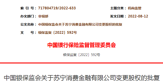 【大河财立方消息】8月23日,银保监会批复,同意南京银行受让苏宁易购持有的苏宁消费金融有限公司36%股权和江苏洋河酒厂持有的苏宁消金5%股权,法国巴黎银行受让苏宁易购持有的苏宁消金3%股权。