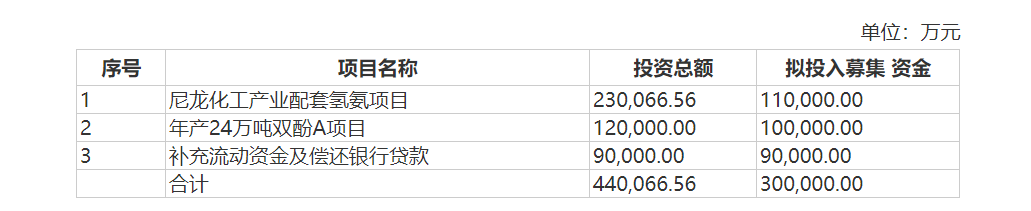 此次发行的募集资金扣除发行费用后,募集资金净额拟11亿元用于尼龙化工产业配套氢氨项目,10亿元用于年产24万吨双酚A项目,9亿元用于补充流动资金及偿还银行贷款。