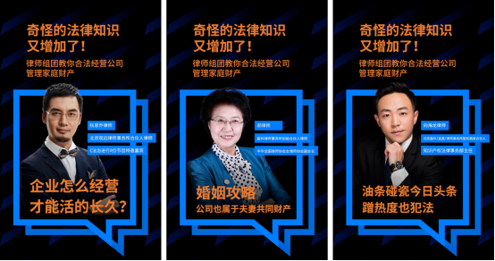 在生意、生活、工作中,假如遇到类似的权益纠纷,如何发现有利于自己的重要线索,依靠法律途径解决?8月26日全国律师咨询日来临之际,天眼查发起#奇怪的法律知识又增加了#花式普法活动,联合阮思乔、郝惠珍、汪世龙、向海龙、朱红霞等多位业内知名律师,针对公司稳健成长、知识产权保护、婚内财产保护等3大类民生热议的法律问题,组团为大家普法支招。
