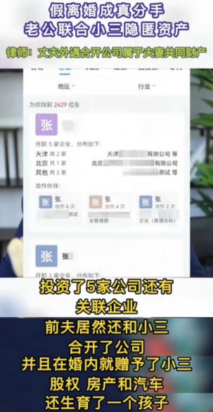 盈科律师事务所创始合伙人、中华全国律师协会女律师协会副会长郝惠珍律师称,如果遭遇“假离婚、真外遇”的离婚欺瞒事件,在证据收集环节可以借助天眼查查询对方的公司财产情况,比如是否属于公司大股东,名下关联企业,执行债权等。假如遇到婚姻存续期间与“小三”合伙开公司的情况,在法律上依然属于夫妻婚内共同财产。提起离婚后的财产纠纷诉讼,就能按照资金走向全部追回,保全原本属于自己的财产。