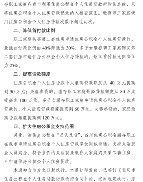 住房公积金个人住房贷款个人最高贷款额度从40万元提高到50万元;夫妻参贷的,家庭最高贷款额度提高到120万元。此外,还将扩大住房公积金支持范围。深化川渝住房公积金“互认互贷”。