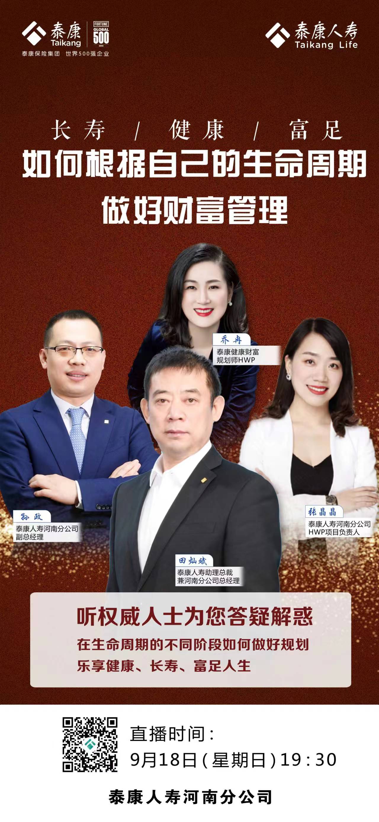 9月18日19:30,泰康人寿河南分公司直播首秀将在分公司官方视频号开展,泰康人寿助理总裁兼河南分公司总经理田灿斌将带领四人专家团队围绕该主题在直播间作干货分享,无论对保险专业人士还是普通民众,内容都将看点十足。