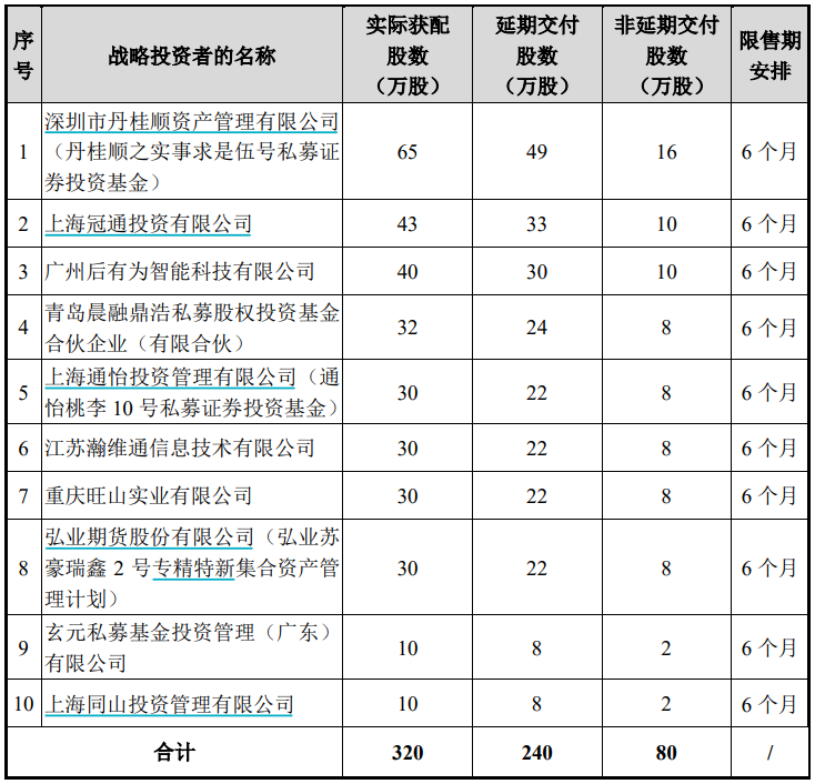 其中,战略配售发行数量为320万股,战略配售募集资金金额合计2240万元。深圳市丹桂顺资产管理有限公司(丹桂顺之实事求是伍号私募证券投资基金)、上海冠通投资有限公司、广州后有为智能科技有限公司等10家机构参与战略配售。