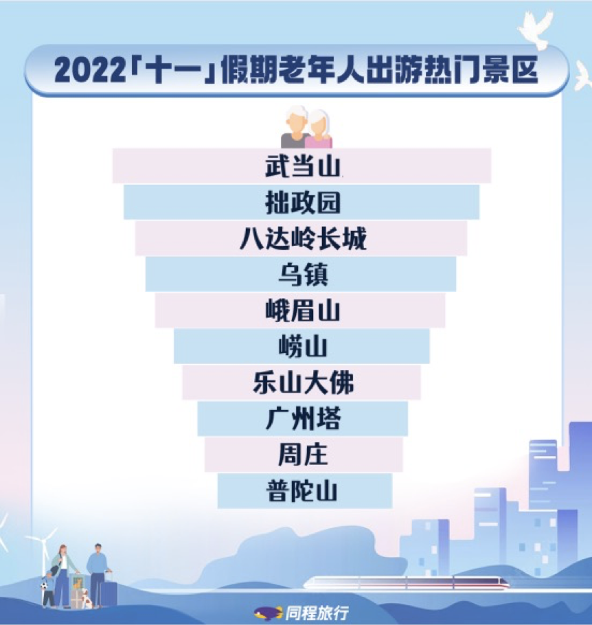 10月4日当天,“十一”长假遇上了重阳节,老年人出游成为人们关注的话题。同程旅行数据显示,今年“十一”假期,老年游客关注度最高的三个景区分别是武当山风景区、拙政园和八达岭长城。此外,峨眉山、崂山、乐山大佛和普陀山等众多著名的山岳类景区也进入榜单前十。