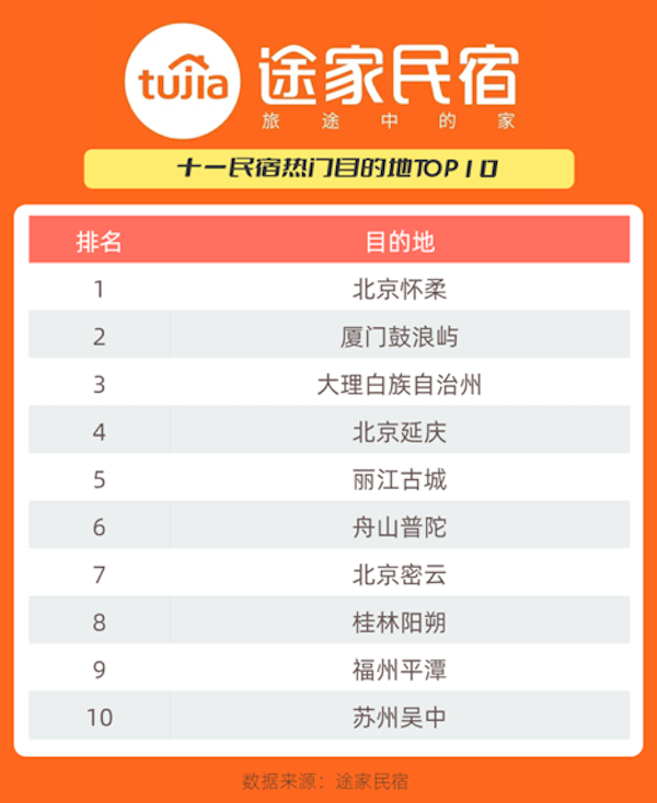 这个假期,民宿产品颇受欢迎。途家数据显示,今年“十一”民宿热门目的地TOP10依次是:北京怀柔、厦门鼓浪屿、大理白族自治州、北京延庆、丽江古城、舟山普陀、北京密云、桂林阳朔、福州平潭、苏州吴中。北京自中秋以来持续稳居第一,辖下怀柔、延庆、密云三个郊区同时上榜,怀柔民宿预订量同比去年增长六成,乡村民宿的火爆决定了北京民宿领跑全国的地位。