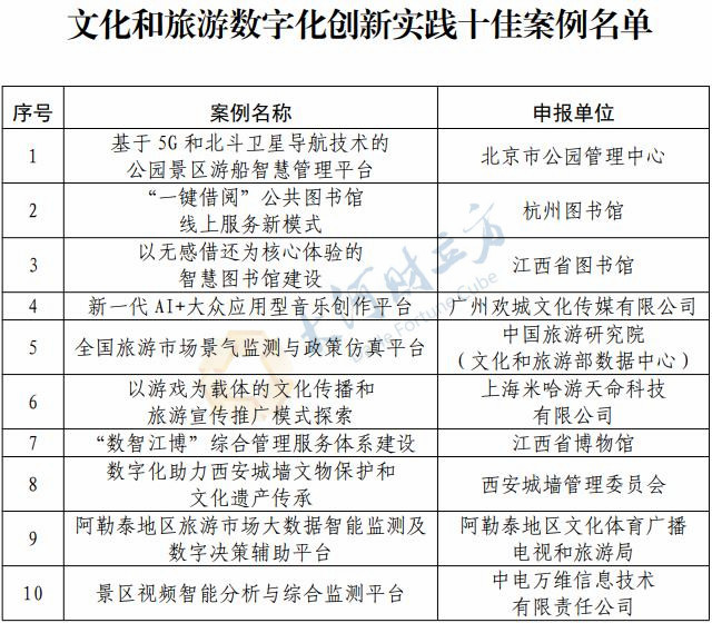 【大河财立方消息】近日,文化和旅游部办公厅发布2022年文化和旅游数字化创新实践案例,确定“基于5G和北斗卫星导航技术的公园景区游船智慧管理平台”等10个案例为2022年文化和旅游数字化创新实践十佳案例,“黄山风景区实践‘数智化转型’大数据精细化运营监管新探索”等20个案例为2022年文化和旅游数字化创新实践优秀案例。