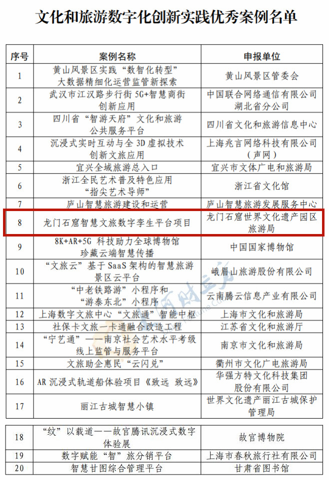 其中,龙门石窟世界文化遗产园区旅游局申报的“龙门石窟智慧文旅数字孪生平台项目”,入选2022年文化和旅游数字化创新实践优秀案例。