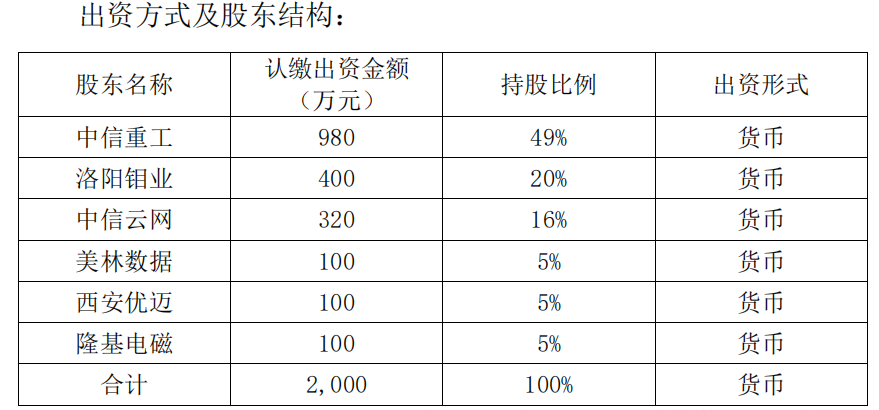 【大河财立方消息】10月13日,中信重工公告称,为提高关键核心技术创新能力,加速“先进智造”转型,促进产业升级,推动传统产业智能升级和高质量发展,持续强化公司矿山及重型装备领域的领先优势,拟以自有资金出资联合中信云网有限公司(以下简称“中信云网”)等合作方合资设立国创智能矿山装备研究院(洛阳)有限公司(以下简称“国创智能”),公司认缴出资980万元人民币,持股 49%。关联方中信云网认缴出资金额 320 万元人民币,持股 16%。