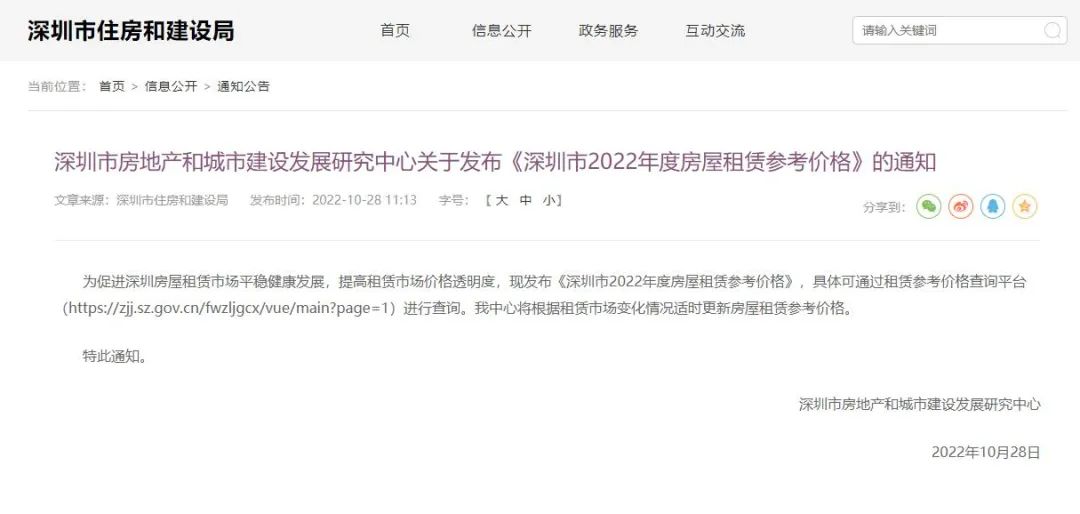 10月28日,深圳市房地产和城市建设发展研究中心发布关于《深圳市2022年度房屋租赁参考价格》的通知。