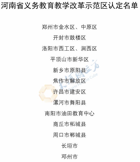 【大河财立方消息】11月3日,河南省教育厅发布通知,经各地推荐、专家评议、网上公示,认定郑州市金水区等15个县(市、区)为河南省义务教育教学改革示范区,郑州市金水区文化路第一小学等115所学校为河南省义务教育教学改革示范校。