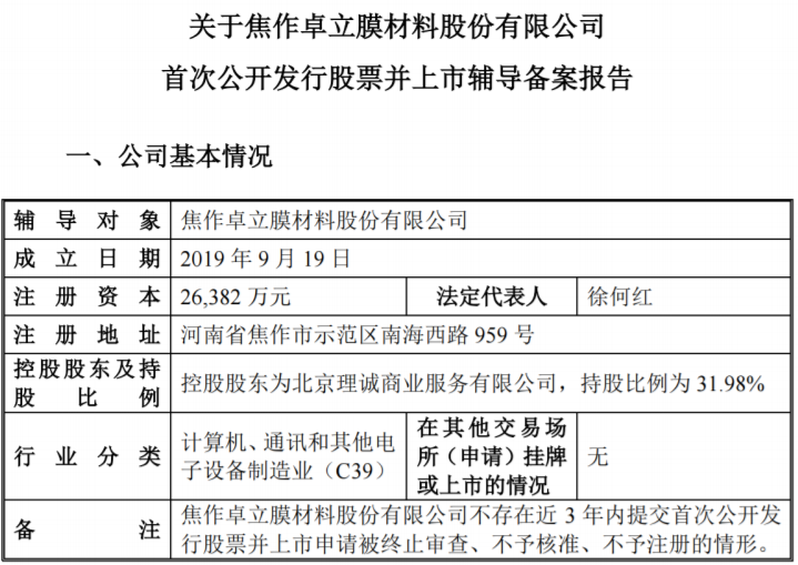 【大河财立方消息】11月4日,中国证监会官网披露民生证券《关于焦作卓立膜材料股份有限公司首次公开发行股票并上市辅导备案报告》。
