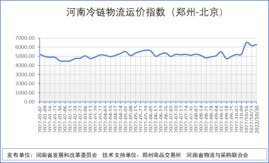 四季度至今,受市场供需和疫情影响,冷链运价指数震荡幅度较三季度明显加剧。截至10月底,冷链运价指数(郑州-北京)为最高价为6522元/车,10月30日较上周小幅上升135.6元。