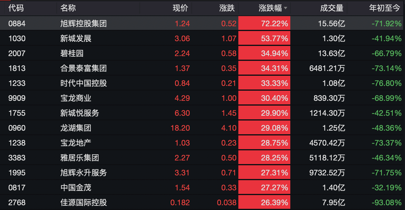 截至收盘,旭辉控股集团的涨幅已超过72%,报1.24港元,较3个交易日前的股价已然翻倍;碧桂园、龙湖集团的涨幅在30%左右,分别报2.24港元、18.2港元,较几个交易日前亦接近翻倍。此外,新城发展涨幅超50%,时代中国控股、合景泰富等个股涨幅超30%。
