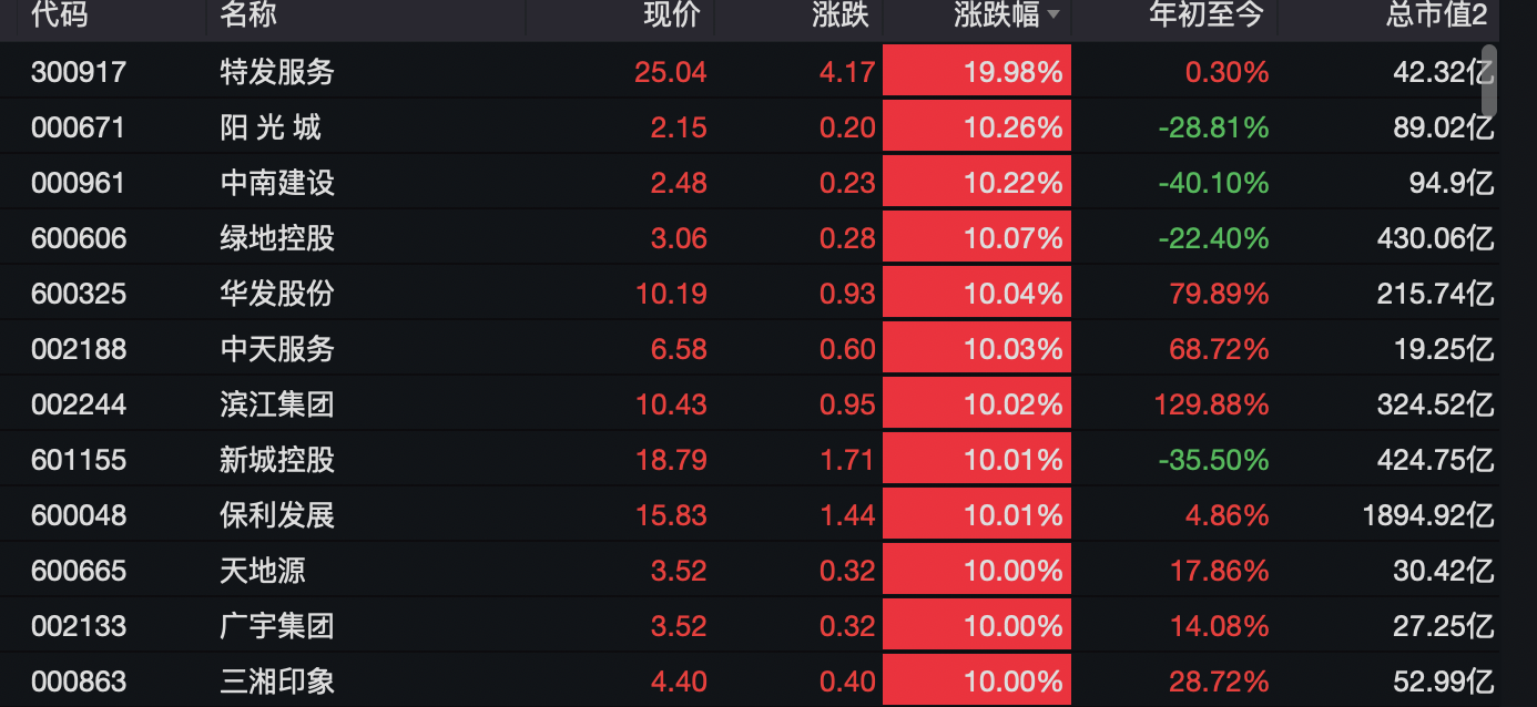 11月11日早盘,地产股普遍高开高走,多只个股保持上涨态势,并在午后迅速掀起涨停潮。截至收盘,房地产(申万)以6.79%的涨幅领涨,115只成份股中仅有3只下跌,包括阳光城、中南建设、绿地控股、华发股份等在内的18只地产股涨停。其中千亿元级市值的万科A、保利发展也同样封住涨停。