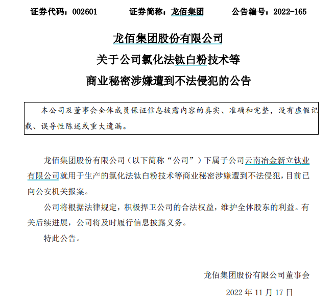 【大河财立方消息】11月17日,龙佰集团公告,其下属子公司云南冶金新立钛业有限公司就用于生产的氯化法钛白粉技术等商业秘密涉嫌遭到不法侵犯,目前已向公安机关报案。