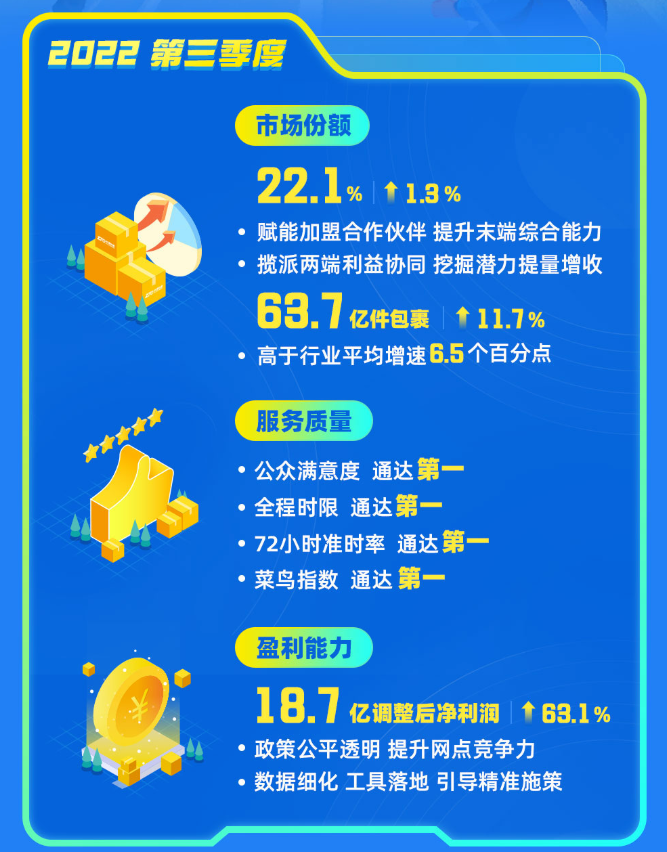 财报显示,中通在包裹量及单票价格双增长的综合影响下,三季度毛利率同比上升6.1个百分点至27.3%。中通还修订了先前公布的年度指标,预计2022年的全年包裹量将在243.0亿至247.4亿件,同比增长9%~11%。