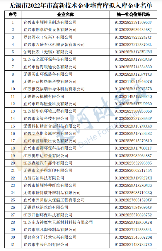 【大河财立方消息】近日,无锡市科技局公示2022年市高新技术企业培育库拟入库企业名单。宜兴市中辉模具制造有限公司、宜兴市创卓炉业设备有限公司、罗普阀业(宜兴)有限公司等928家企业上榜,公示时间自2022年11月25日至2022年12月1日。
