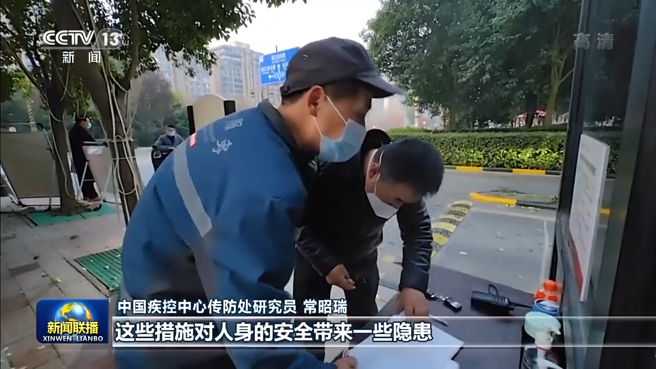 中国疾控中心传防处研究员 常昭瑞:高风险区域的区域封控,要求封闭的家庭要足不出户。我们更多的是要采取像上门磁的这种软性的管控措施来做到足不出户,而不是要采取封门、上锁,封锁消防通道等硬性的封控措施,这些措施对人身的安全带来一些隐患。