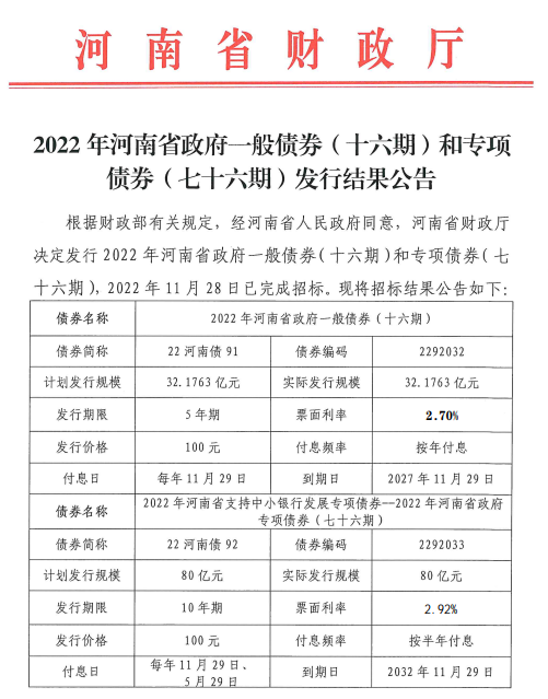 【大河财立方消息】11月28日河南省财政厅消息,河南5年期政府一般债“22河南债91”、10年期支持中小银行发展专项债“22河南债92”完成招标,中标利率分别为2.70%、2.92%。