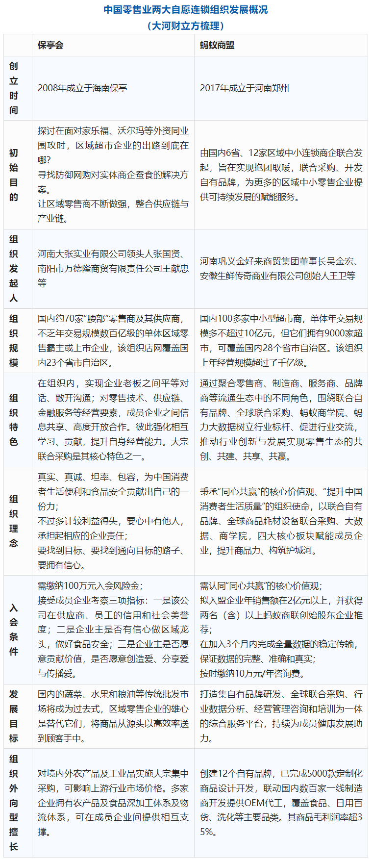 不过,二人对话能被国内工商业广泛关注,是他们身后两个强大的组织。两个组织都能覆盖国内绝大多数省份零售市场,门店数量过万、年交易规模均在千亿级,日均触达消费在数千万级。两大组织创立初衷、战略方向与抓手虽不同,但二者内部的组织紧实性与协同性特征却同样出色。更引人好奇的是,保亭会与蚂蚁商联本该是竞争体,可粗略概括为“省市级区域商业龙头企业VS市县级超市小霸王”。就如,大张超市在洛阳、金好来在郑州巩义,双方相距仅百公里,企业规模又是10倍差距。那么,二者可有平等对话的依据?