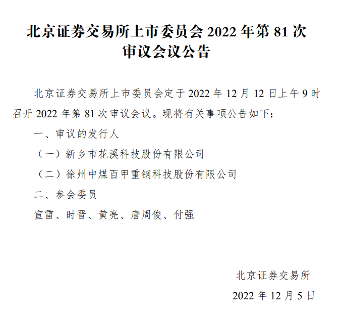12月5日,北交所公告,定于12月12日召开2022年第81次审议会议,审议新乡市花溪科技等公司首发事项。