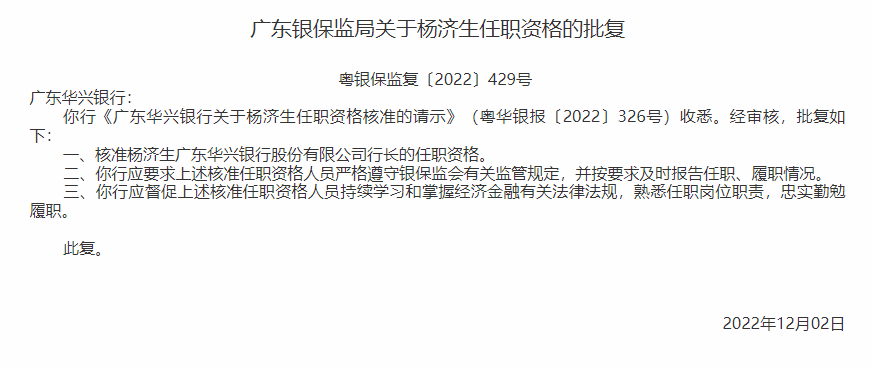 【大河财立方消息】12月8日,广东银保监局批复,核准杨济生广东华兴银行股份有限公司行长的任职资格。