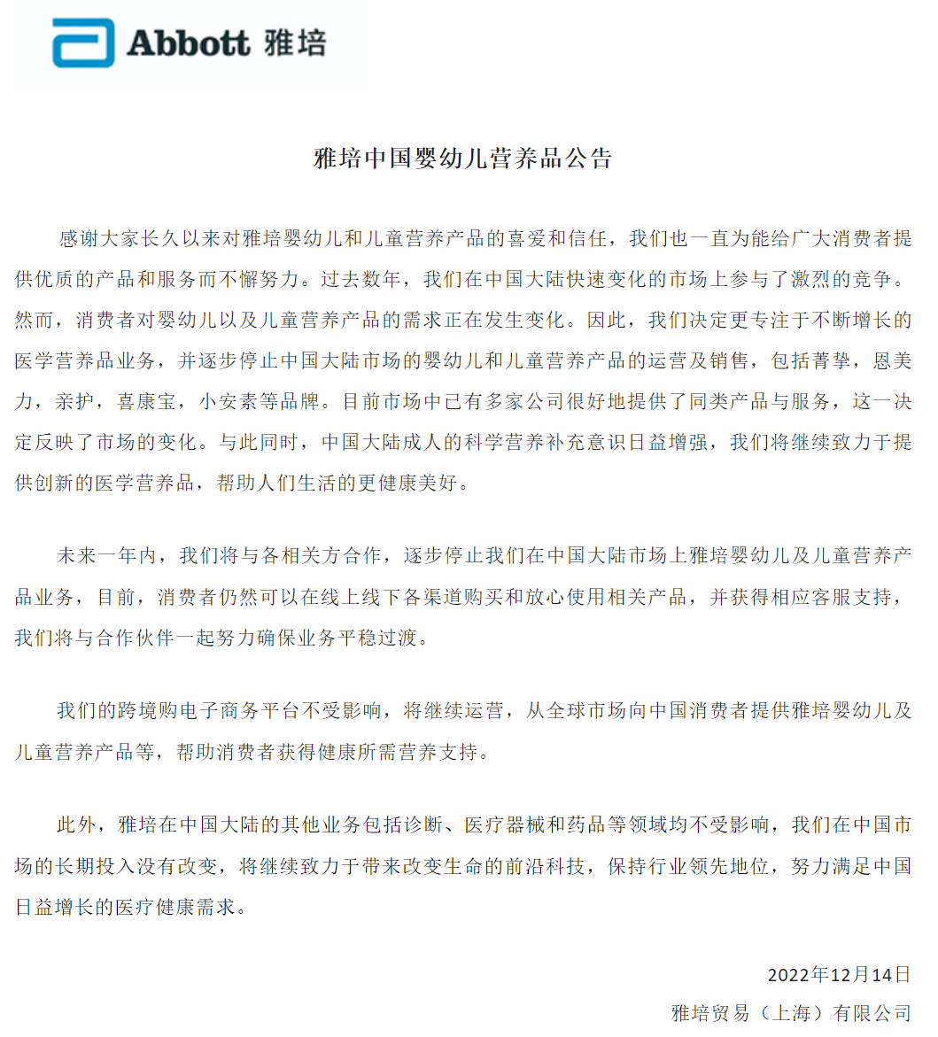 【大河财立方消息】12月14日,雅培贸易(上海)有限公司发布公告称,未来一年内,将与各相关方合作,逐步停止在中国大陆市场上雅培婴幼儿及儿童营养产品业务,目前,消费者仍然可以在线上线下各渠道购买和放心使用相关产品。