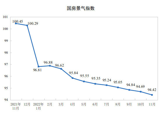 11月份,房地产开发景气指数(简称“国房景气指数”)为94.42。