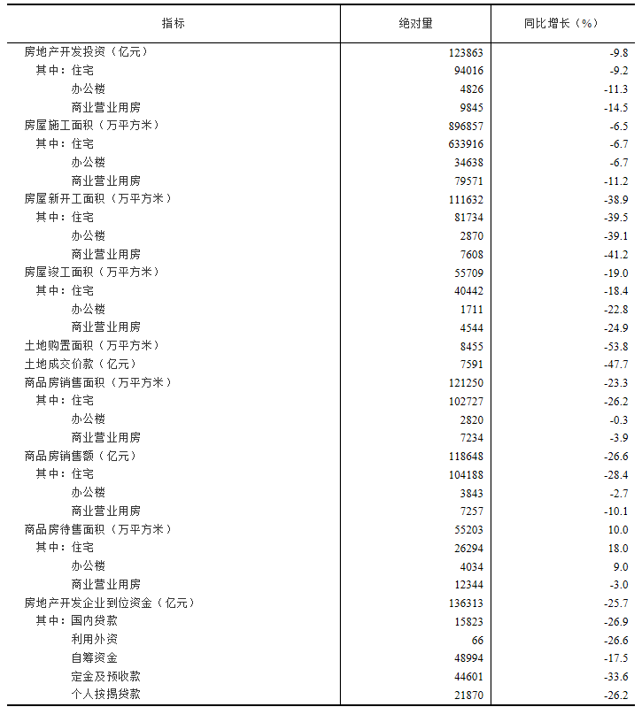 1—11月份,房地产开发企业房屋施工面积896857万平方米,同比下降6.5%。其中,住宅施工面积633916万平方米,下降6.7%。房屋新开工面积111632万平方米,下降38.9%。其中,住宅新开工面积81734万平方米,下降39.5%。房屋竣工面积55709万平方米,下降19.0%。其中,住宅竣工面积40442万平方米,下降18.4%。