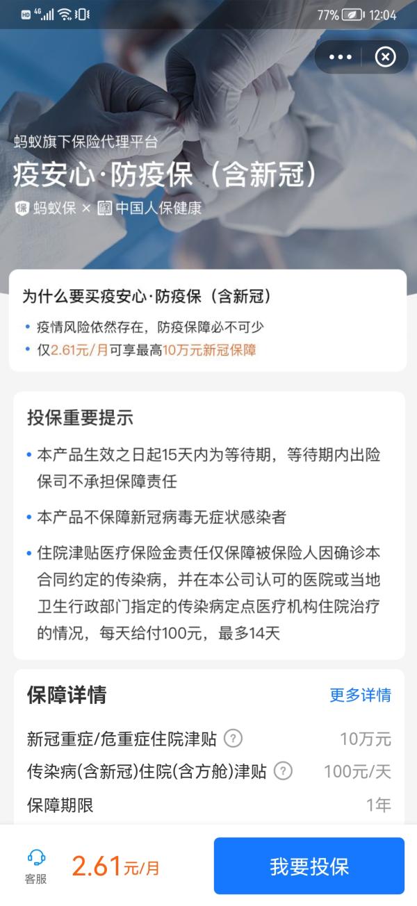 目前仍在售的新冠保险,主要保重症、危重症。澎湃新闻检索发现,在蚂蚁旗下保险代理平台上,有一款由中国人保健康承保的,名为“疫安心·防疫宝(含新冠)”的保险产品仍然在售。但与此前众多新冠险不同,这款产品只对重症及危重症人员给予赔付——新冠重症/危重症住院津贴,保额为10万元;传染病(含新冠)住院(含方舱)津贴100元/天。