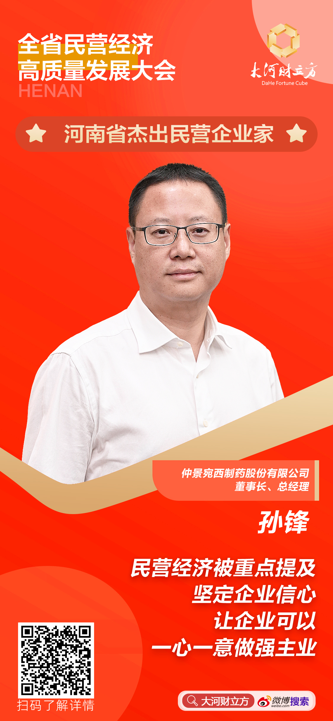 【大河财立方 记者 唐朝金】12月20日,全省民营经济高质量发展大会在郑州召开。会上一批优秀的民营企业、企业家获得表彰。宛西制药董事长、总经理孙锋荣获“河南省杰出民营企业家”称号。