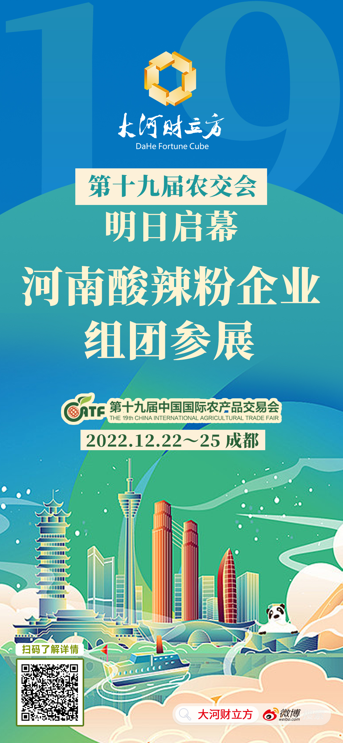 12月22日,第十九届中国国际农产品交易会将在四川省成都市中国西部国际博览城举办。在这次农交会上,河南将设省综合展区和各省辖市展区,集中展现河南省“豫农优品”的新成绩、新发展。其中,省综合展区将有河南省酸辣粉及产业链企业组团参展,呈现河南酸辣粉产业蓬勃发展之势。