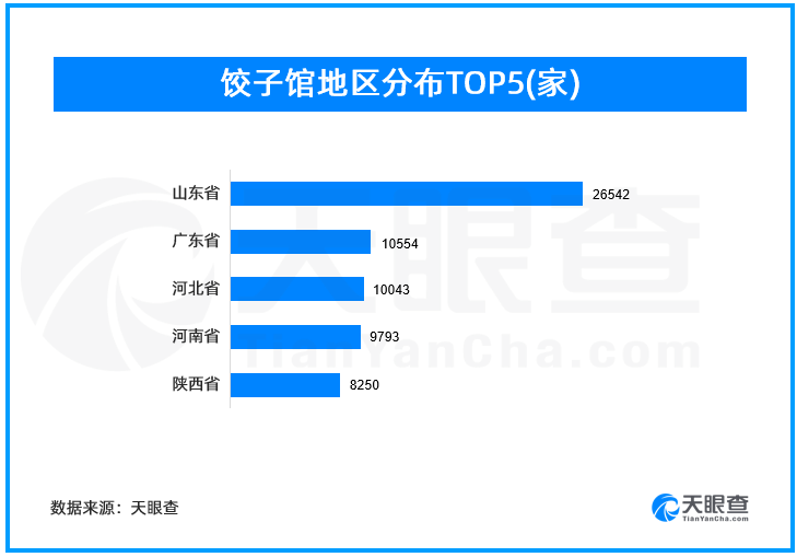 从地区分布上看,山东有超2.6万家饺子馆相关企业,遥居全国首位;广东省、河北省则各有超1万家,位居第二、第三;河南、陕西分别拥有9700余家、8200余家,分列第四、第五位。