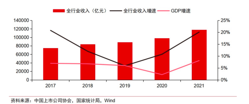 过去5年中,我国高端制造上市公司营收持续增长,由2017年的7.47万亿元增长至2021年的11.79万亿元,复合增长率为12%, 2021年同比增长率达到20.1%。除2019年疫情影响生产交付外,高端制造业增速领先我国GDP增速5个百分点以上。