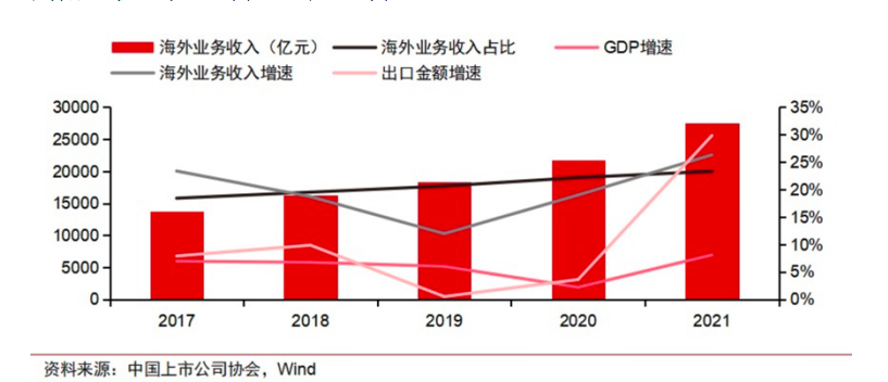 我国高端制造业上市公司在过去几年海外布局逐渐加速,海外业务收入占比持续快速提升。海外业务贡献总收入由2017年的13.77万亿元提升至2021年27.51万亿元,实现收入翻倍;收入比例逐渐提升,截至2021年,23%的营业收入由海外业务贡献。