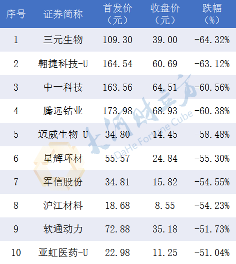其中,10只个股价格较发行价腰斩,113只个股价格较发行价下跌超20%。