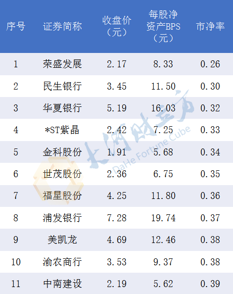 荣盛发展最新股价2.17元/股,每股净资产为8.326元,市净率仅为0.26。民生银行、华夏银行、*ST紫晶等35只个股市净率均低于0.5,相当于上市公司资产在二级市场“打对折处理”。